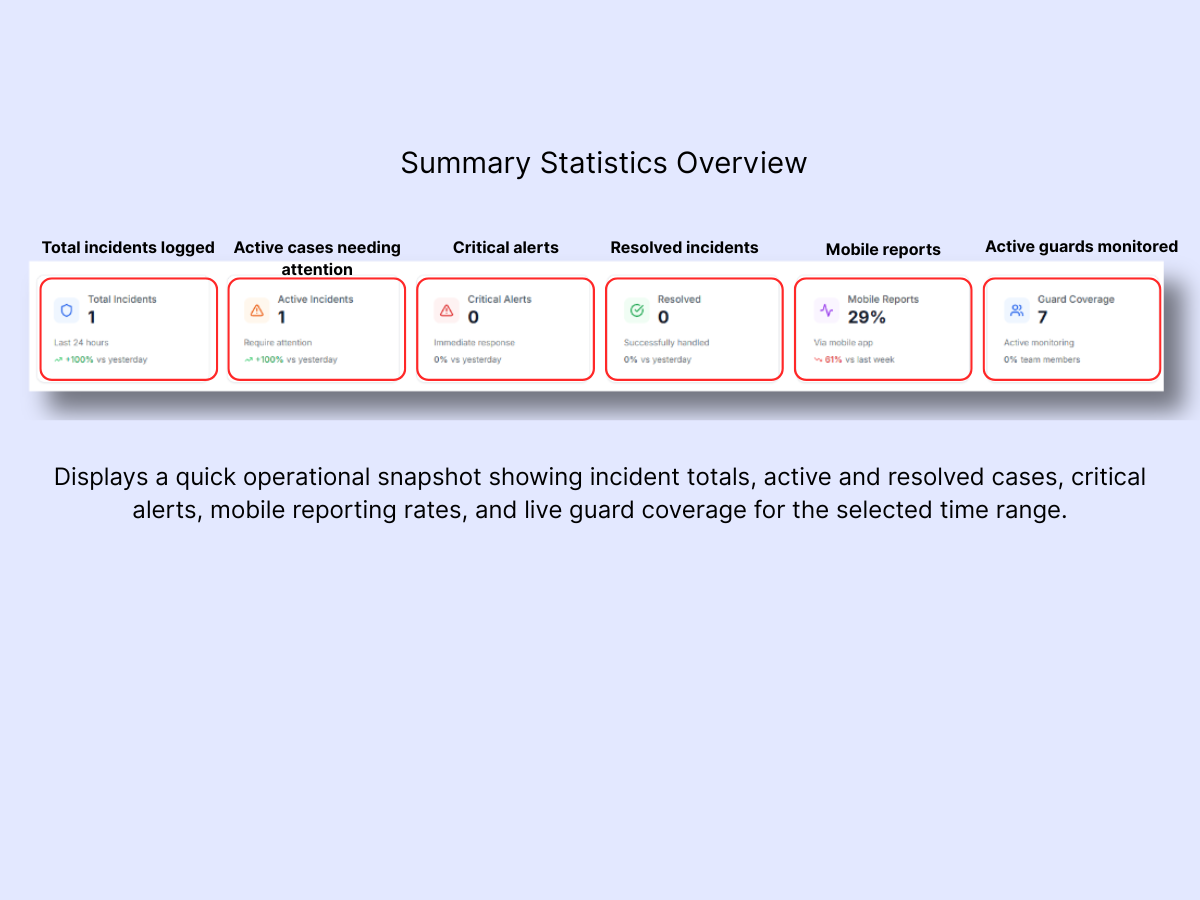 The Dashboard tab is the admin’s command center. It gives you a live overview of your organization’s security operations: incidents, alerts, guard coverage, and system performance. Every report submitted by a guard appears here instantly.