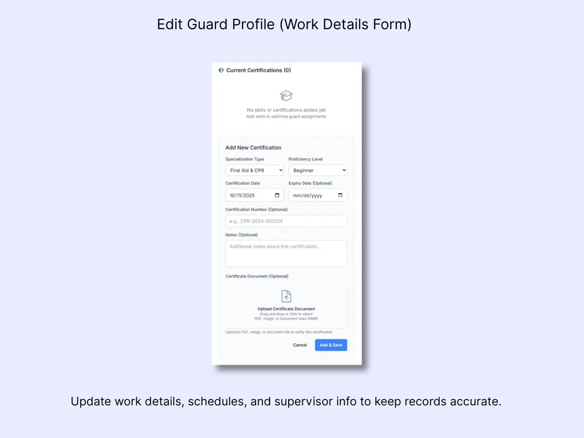 Once added, certifications automatically appear under Current Certifications. You can edit or remove them later if needed. These records are used for filtering guards by specialization and assigning them to tasks.