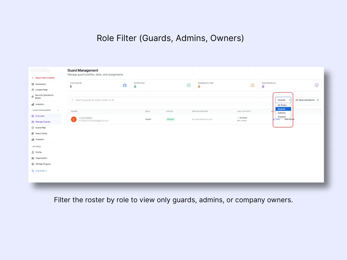 This page lists all guards in your organization, their status (On Duty / Offline), and their specializations or last activity. From here, you can search for guards, open profiles, and manage their records.