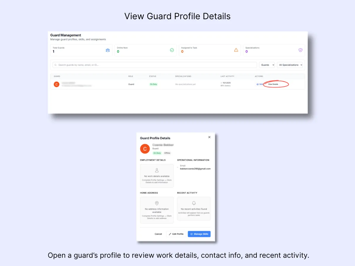 Click View Details next to a guard’s name to open their profile. Here you’ll see: