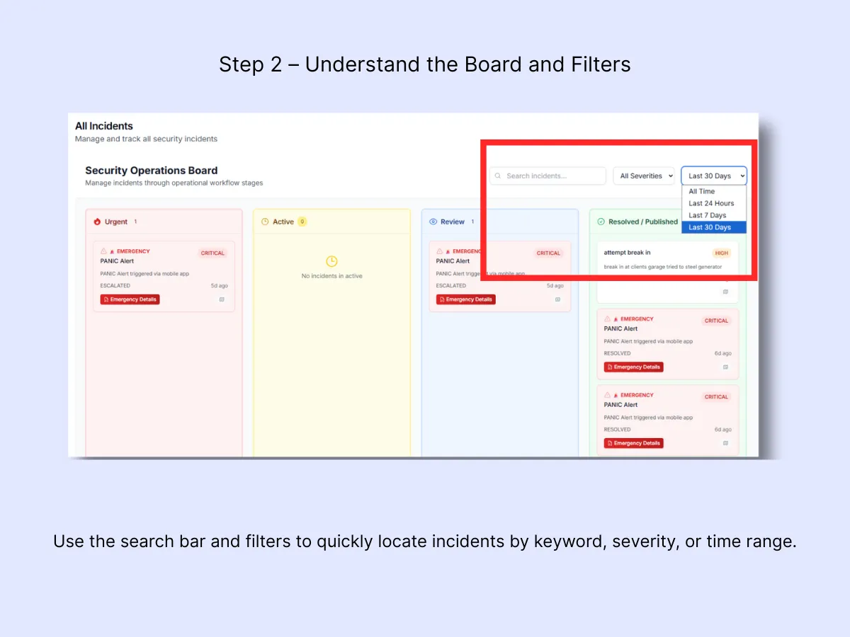Tip: Keep the Security Operations Board open during shifts to monitor real-time activity. It gives the clearest view of what’s happening, what’s pending, and what needs escalation.