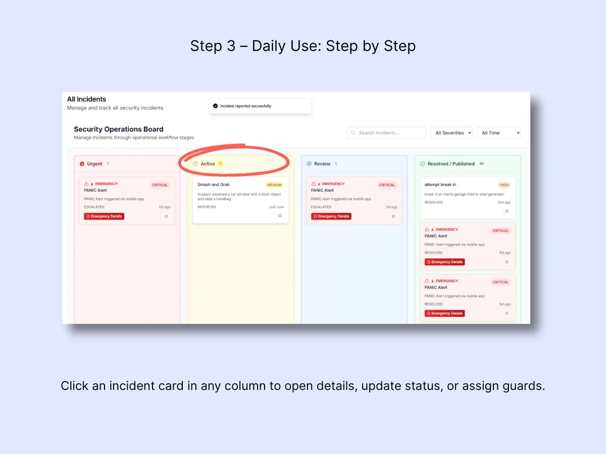 Assign Guard – Link the nearest guard to the incident.