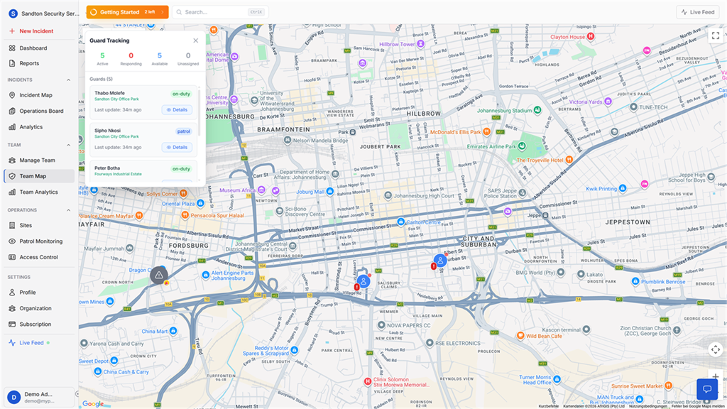 Incidents, patrols, GPS tracking, panic alerts, and guard management in one platform. Built for SA security companies with 5 to 100+ guards.
